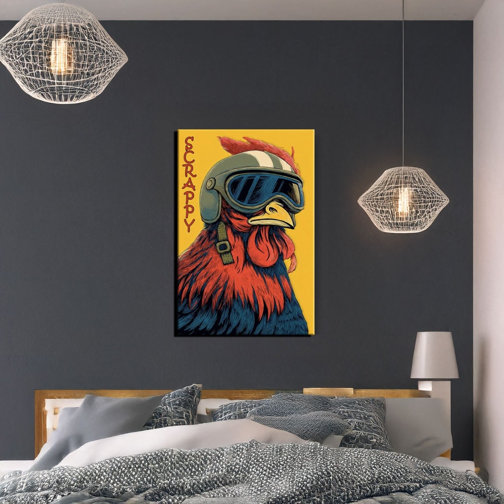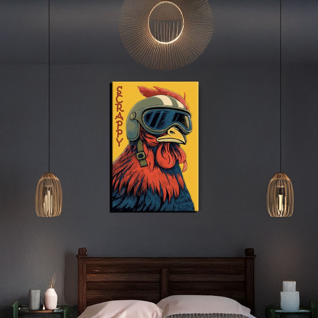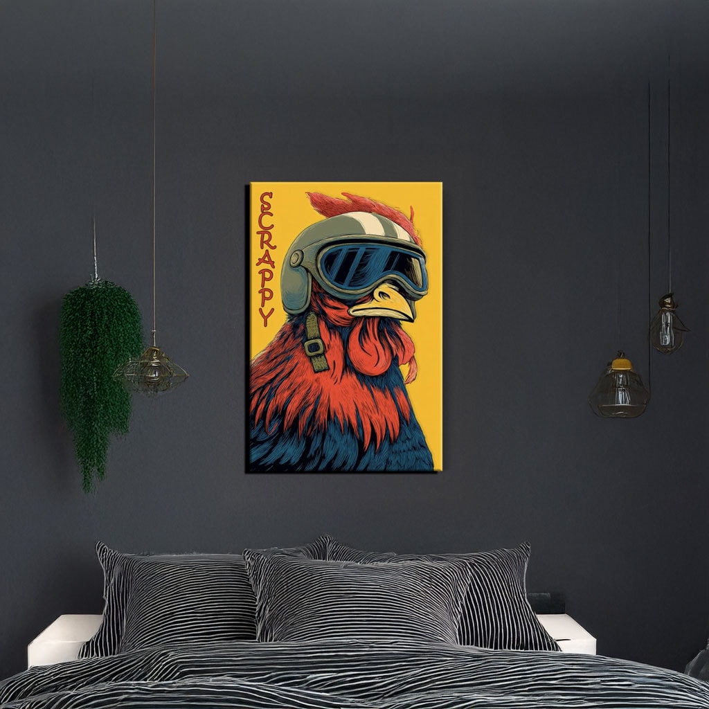 This Scrappy the Rooster–inspired print brings humor, style, and futuristic charm straight into your room.