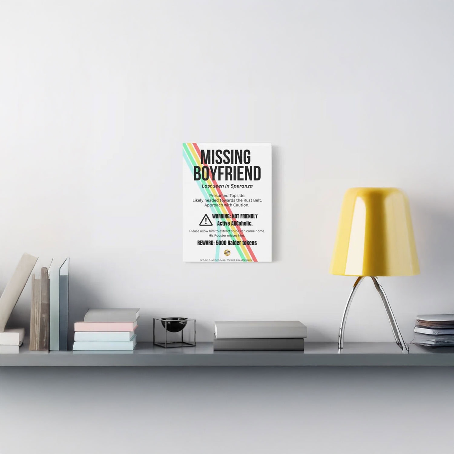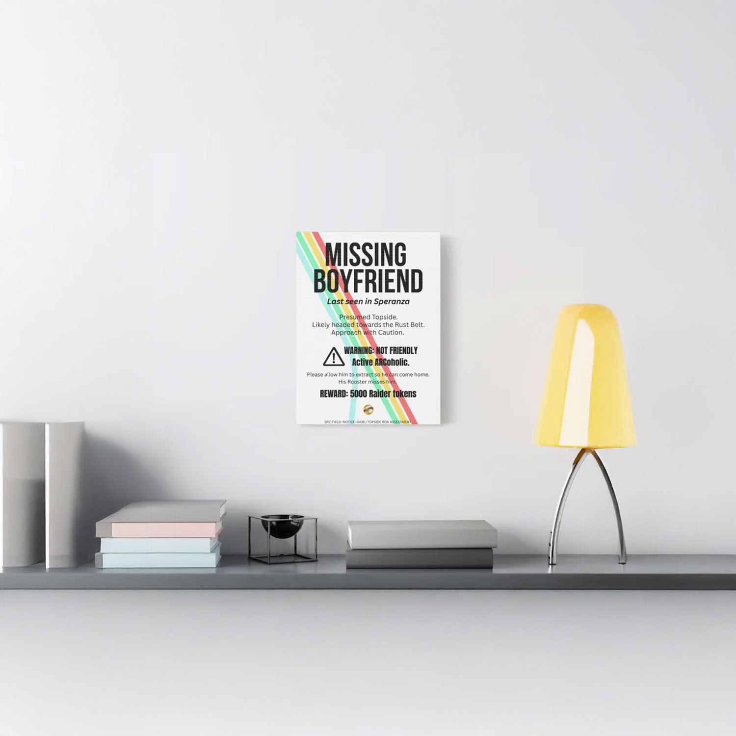 Bring an iconic narrative hook to your décor with the ARC Raiders Missing Boyfriend Poster — a perfect collectible for fans who love story-heavy props, sci-fi mystery, and immersive wall art.