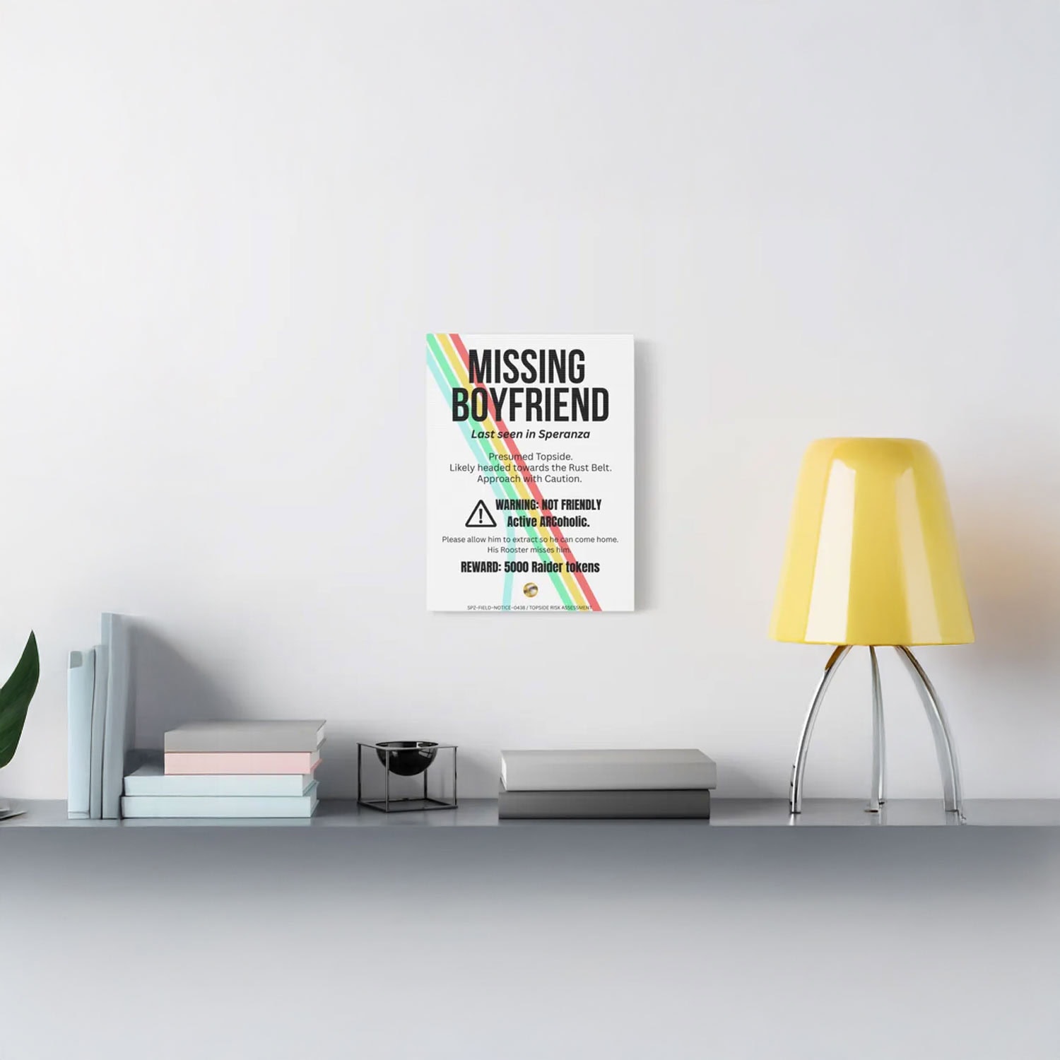 High-definition “Missing Boyfriend” notice styled like in-game world signage