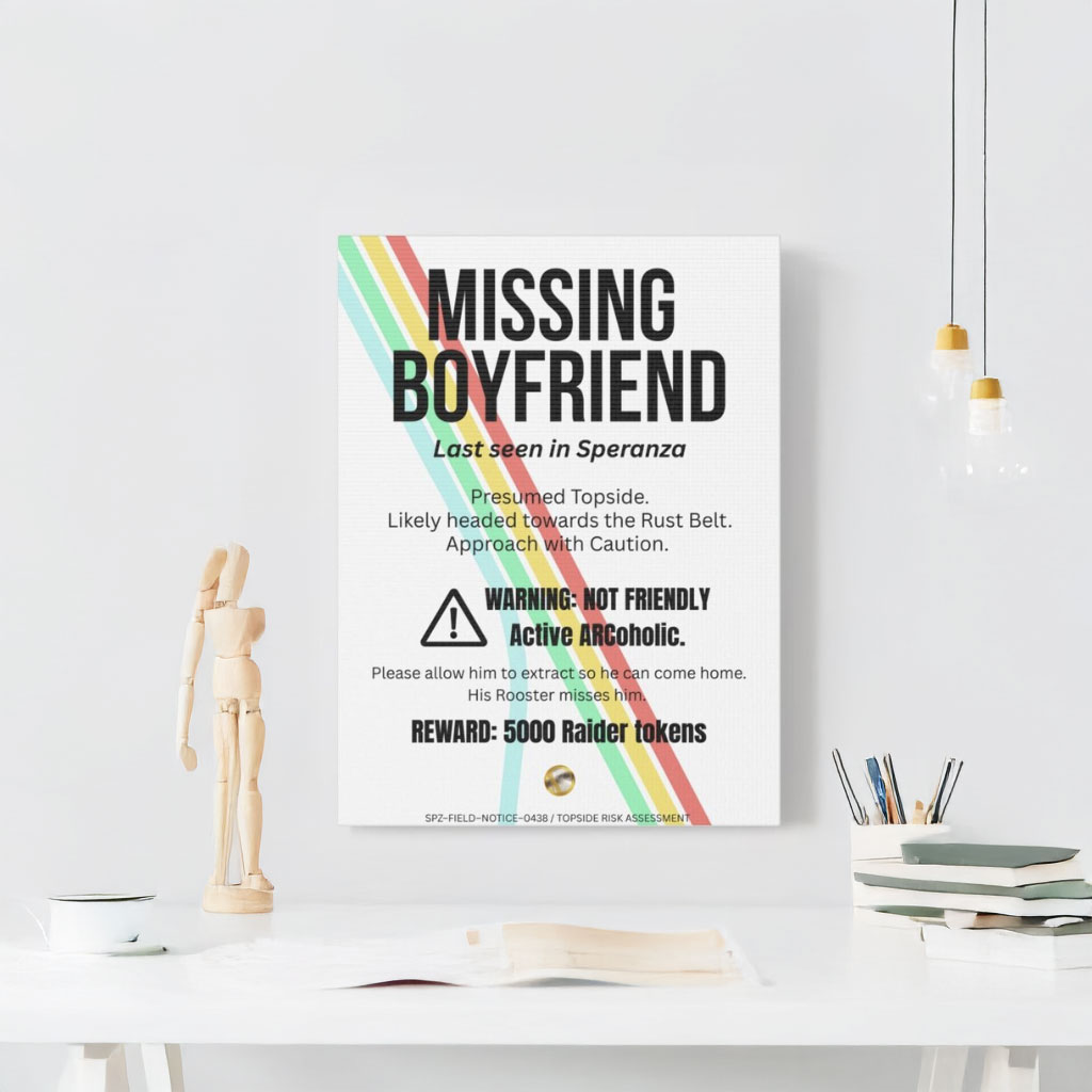 Whether you’re building a themed gallery wall or looking for a quirky centerpiece, this ARC Raiders Missing Boyfriend Poster adds personality, creativity, and a hint of story-driven chaos to your décor.