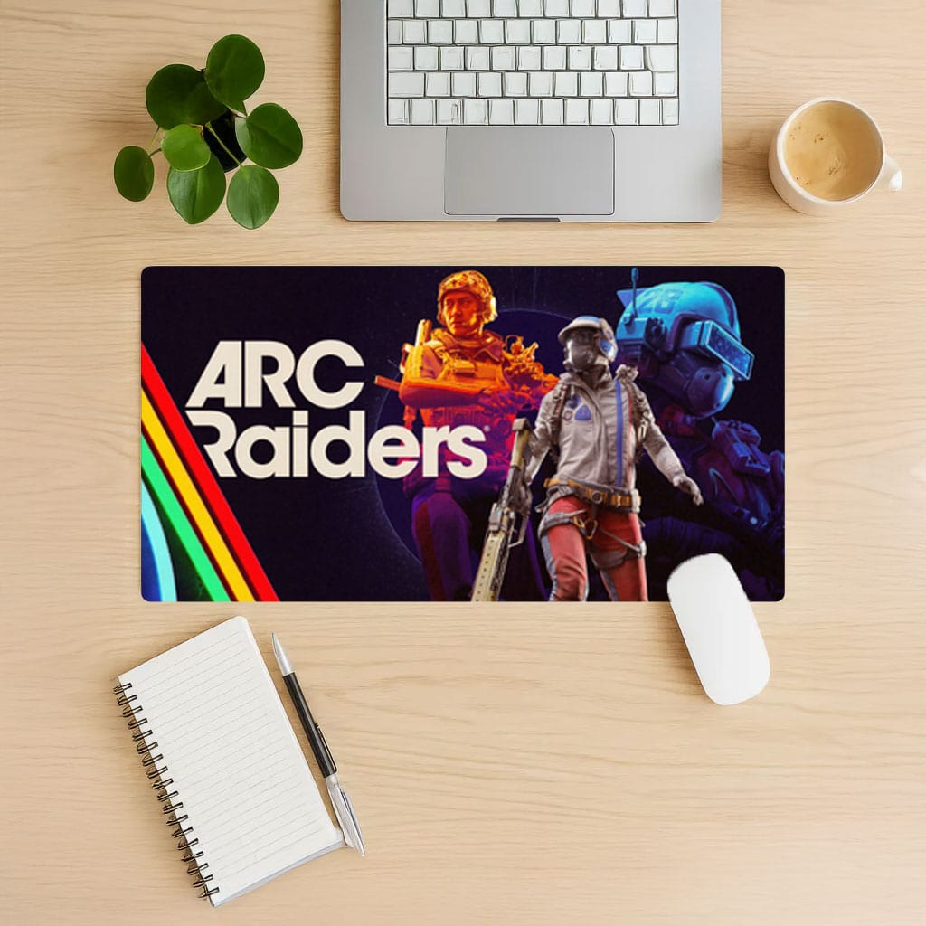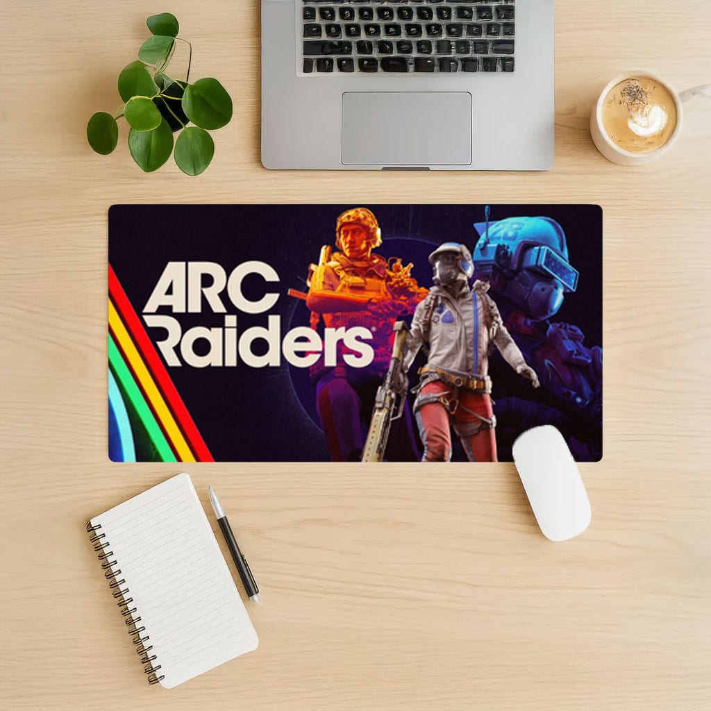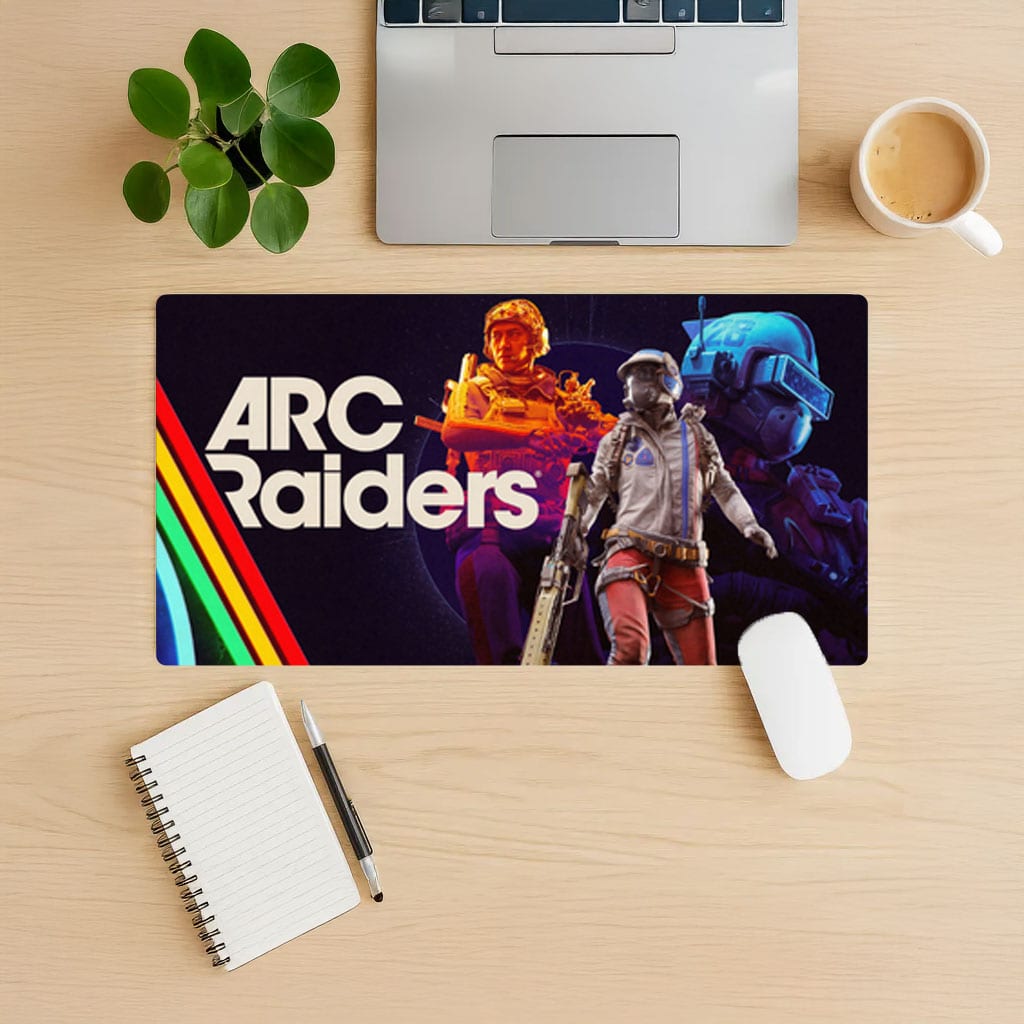 ARC Raiders fans, sci-fi shooter gamers, PC and console players, streamers, esports desk setups, or anyone looking for a bold ARC Raiders desk mat with neon squad artwork and futuristic style.