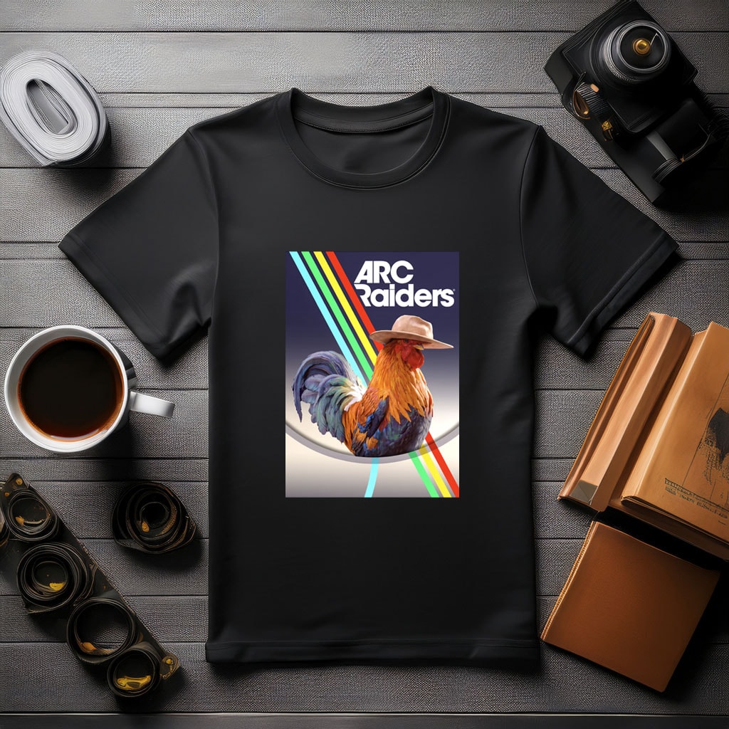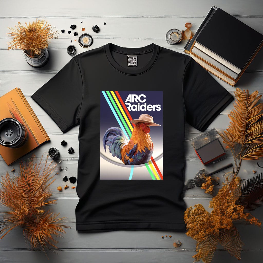 This shirt features a fearless rooster styled as a futuristic cowboy—complete with a bold cowboy hat and attitude to match. The artwork brings together Arc Raiders’ atmospheric world and a fun, unexpected character concept, making it one of the most memorable designs in your collection.