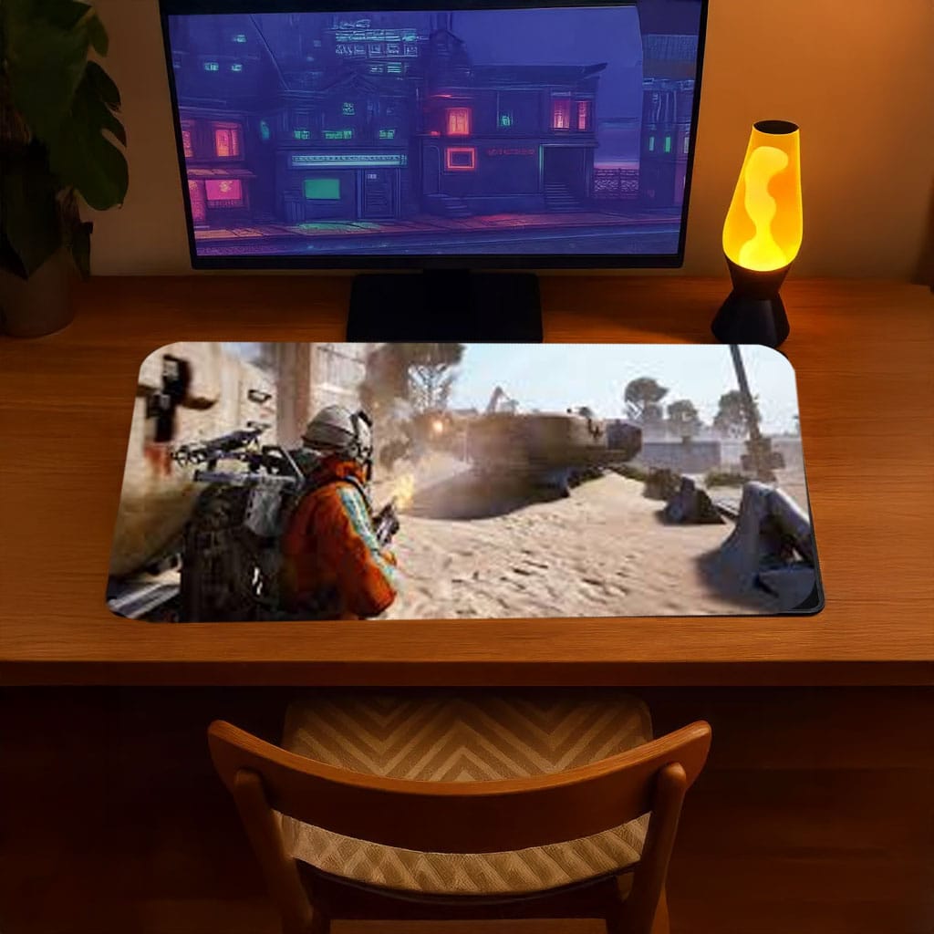 Featuring dynamic urban battle artwork, the desk mat delivers a bold visual centerpiece while providing an extended surface for your keyboard and mouse. The smooth fabric top supports precise mouse tracking for competitive play and everyday tasks, while the non-slip rubber base keeps everything locked in place during intense sessions.