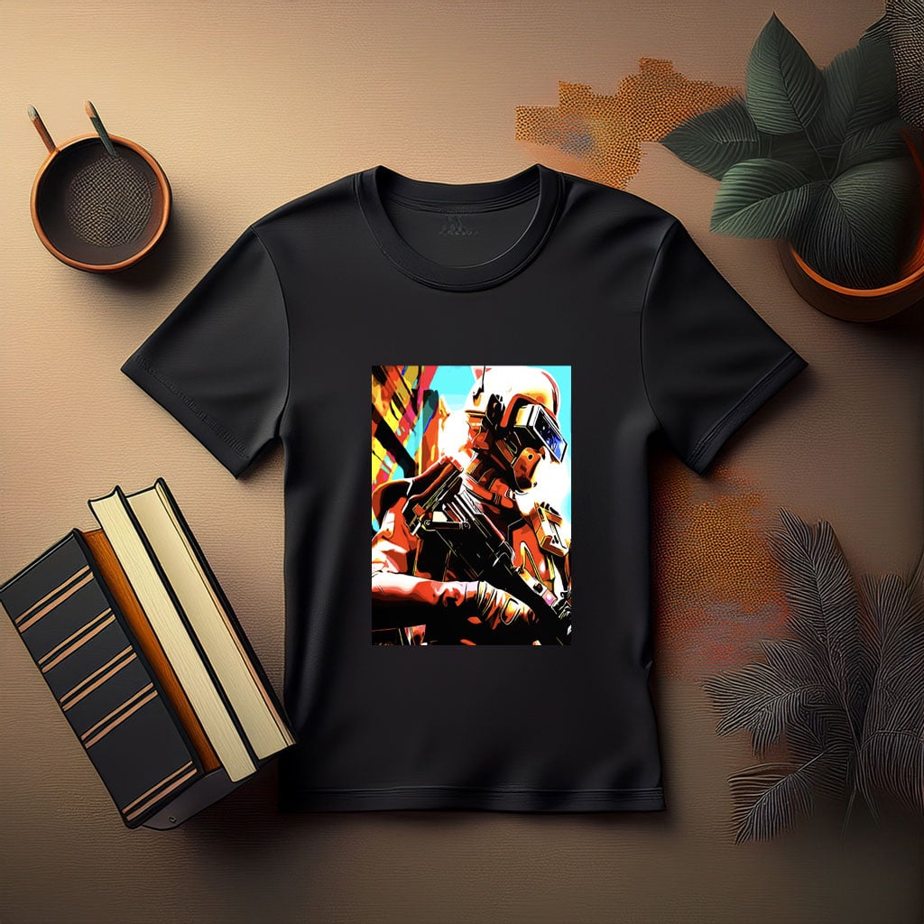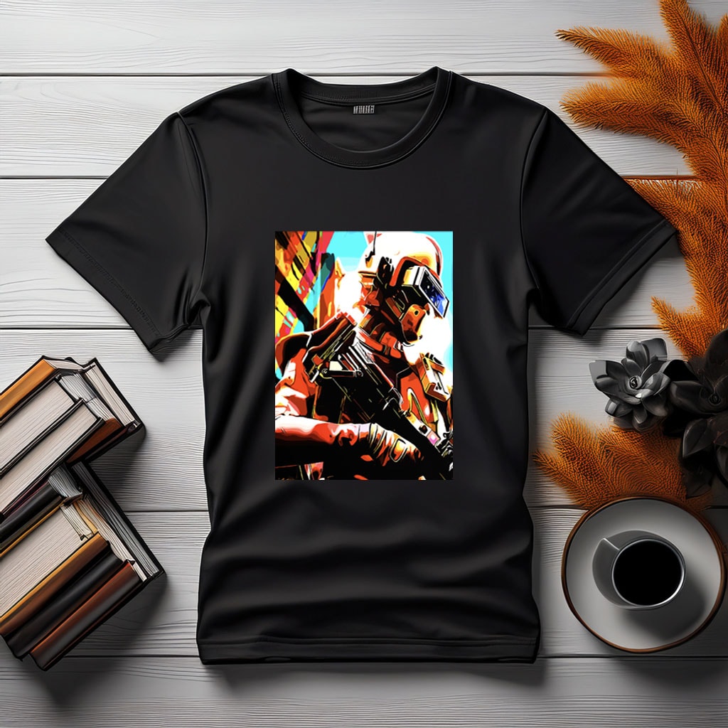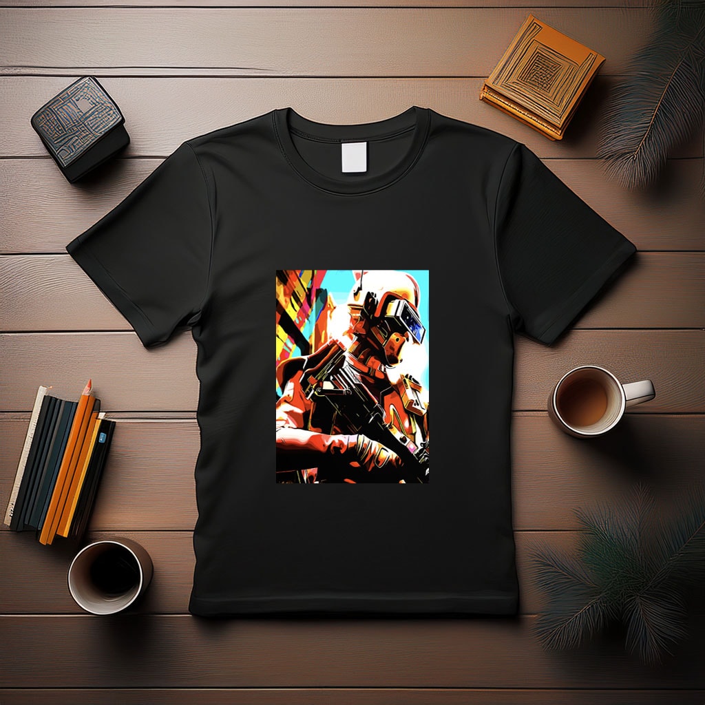 Futuristic Soldier with Weapon T-Shirt – Bold Sci-Fi Combat Style for Modern Warriors