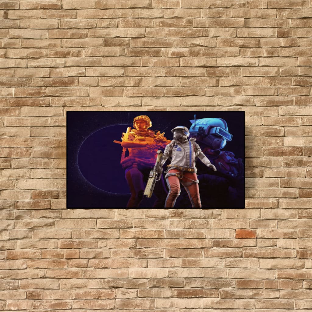 High-resolution, cinematic artwork of futuristic soldiers in a dark environment